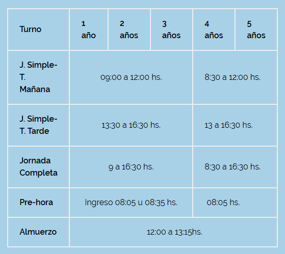 | J. Simple-T. Tarde | 13:30 a 16:30 hs. | 13 a 16:30 hs. | |||